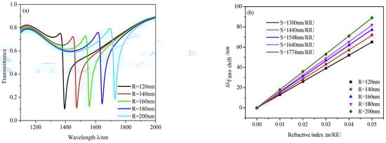Then, the effects of the outer radius of racetrack ring resonator R were analyzed. The values of R changed from 120 to 160 nm at intervals of 10 nm and other values were set as default values when n = 1, whose results are shown in Figure 8. The resonance dip shows an obvious redshift with increasing R as depicted in Figure 8a, which can also be explained by Equation (2) as L could. The S of the design increases from 1505 to 1774 nm/RIU when R increases from 120 to 200 nm, as plotted in Figure 8b. Therefore, the length of the racetrack ring resonator L and the outer radius of the racetrack ring resonator R influences not only the position of Fano dip but also S, which correspond to the narrow band of this system.
