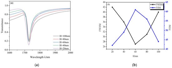Furthermore, we analyzed the influence of different H values on the transmission properties. We changed the values of H from 20 to 100 nm in a step of 20 nm and other values were set as default values when n = 1, whose results are shown in Figure 9. It is clear that by increasing H from 20 to 60 nm, the FWHM decreases, which means that FOM increases and, when increasing H from 60 to 100 nm, the FWHM increases, which means that the FOM decreases. The FOM of the design increases from 42 to 61 and from 61 to 44, as depicted in Figure 9b. However, when H increases, it can be seen that the transmittance increases obviously, which means that H corresponds to the broad band in this system, and results in weakening the sensing performance. Considering these, we set H as 60 nm in this study.