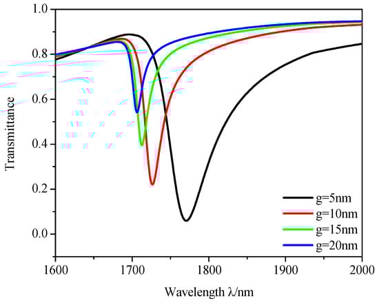 Finally, we analyzed the effects of different coupling distances on sensing properties. The g was set from 5 to 20 nm and the results are plotted in Figure 10. With an increase in g, there is an obvious blueshift and the transmittance increases swiftly and FWHM becomes narrower, which means the confinement of the cavity to energy becomes weaker. Of course, the attenuation distance is = 34 nm longer than the coupling distance. Therefore, we can infer that SPPs from the stub can be coupled into the racetrack ring resonator theoretically.
