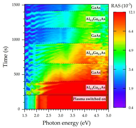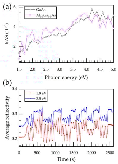 Reflectance anisotropy spectroscopy (RAS) is a nondestructive optical and surface-sensitive technique well established for monitoring epitaxial and dry-etch processes [,,,,]. For example, the use of RAS equipment has had enormous success in terms of monitoring epitaxial growth, providing information about thickness, doping, the presence of quantum dots, and surface re- or deconstruction [,,,,].