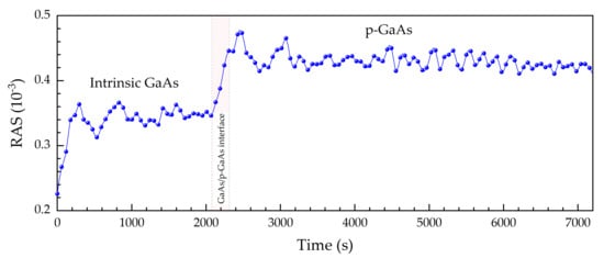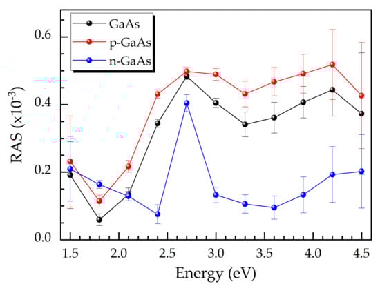 Figure 3 shows RAS spectra of a p-GaAs layer, an n-GaAs layer, and an intrinsic GaAs sample acquired during epitaxial growth. The doping concentration of the p-GaAs layer is slightly above 1019 cm−3, whereas that for the n-GaAs layer is about 7·1018 cm−3. The RAS spectrum for intrinsic GaAs exhibits the typical signature due to the anisotropies on the semiconductor surface [,,]. The RAS spectrum of the p-GaAs layer has a higher RAS signal for all photon energies. In the case of the n-GaAs layer, there is a distinct peak at about 2.4 eV in the spectrum. Taking photon energies above 2 eV allows for a distinction between the p- and the n-type material.