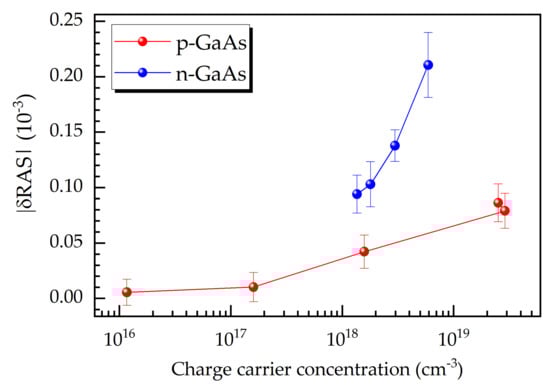 The sensitivity of RAS with respect to doping impurities allows for the determination of doping concentrations (after calibration runs). The semilogarithmic graph in Figure 5 reveals the strong dependence of the quantity |δRAS| at 2.4 eV on the doping or majority charge carrier concentration, where |δRAS| is the difference between the RAS signal of the doped and the intrinsic GaAs layers in absolute values. The results also show that the quantity |δRAS| is more sensitive to the doping level for the n-type material than for the p-type one.