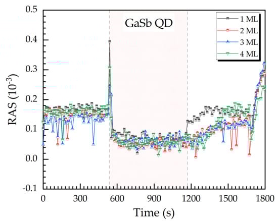 In all four cases, the RAS signal shows a significant peak, as soon as the wetting layer or the QD layer starts to grow. The difference in the lattice constant is large enough to induce strain detectable by RAS [,]. The subsequent increase of the RAS signal slightly later, after the low plateau, can be interpreted as being related to crystal lattice relaxation.