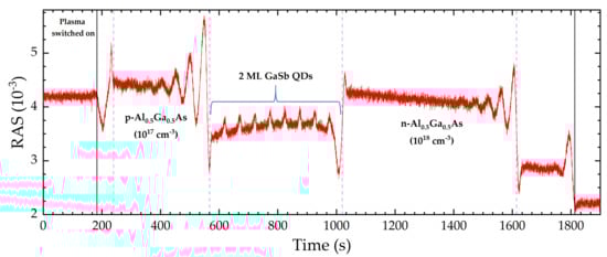 For epitaxy, doping types become distinguishable by employing RAS photon energies from 2.0 to 4.5 eV. It is also possible to estimate the doping level according to the magnitude of the mean RAS signal after previous calibrations []. It is also possible to use the RAS signal for identification of quantum dot (QD) layer growth for nominal coverages of more than 1 or 2 ML.
