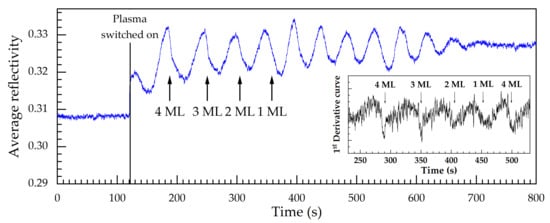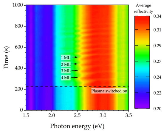 Thus, Figure 9 is used to show a transient of the average reflectivity at 2.6 eV photon energy, where the features are most prominent in the color plot of Figure 8. The dashed vertical line indicates the plasma switch-on. The transient has been achieved during another etch process (beyond that for Figure 8), when only the data for this photon energy have been collected. As mentioned before, to use a transient instead of a color plot upon etching increases the temporal resolution, which plays a central role in pushing up the resolution limit (in etch time or etch depth).
