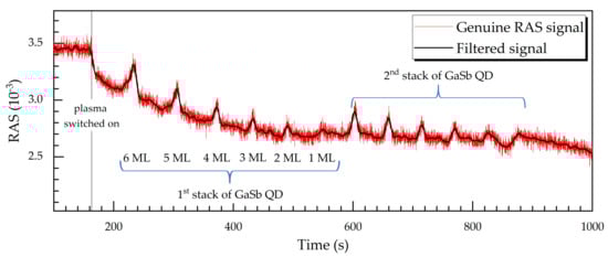 In Figure 8 and Figure 9, we have been dealing with the average reflectivity (the denominator in Equation (1)). Now we are going to have a closer look at the genuine RAS signal again. Figure 10 shows a RAS signal transient (red curve) at 3.05 eV from the RIE process of another sample, this one with two stacks of GaSb QD layers with 6, 5, 4, 3, 2, and 1 ML nominal coverage, again embedded in a 50-nm-thick GaAs barrier and leveling layers. Moreover, the RAS signal is low-pass-filtered using an FFT analysis. There are 12 peaks in the transient, which correspond to two times six GaSb QD layers. The intensity of the signal is proportional to the nominal coverage; that is, the highest peaks correspond to the two cases of 6 ML nominal coverage.