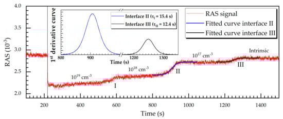 RAS transient acquired at 3.05 eV photon energy during the RIE process for an n-GaAs layer with a charge carrier concentration between 1017 to 1019 cm−3. The RAS signal along interfaces II and III is fitted using Equation (2), and their first derivatives according to Equation (3) as shown in the inset.