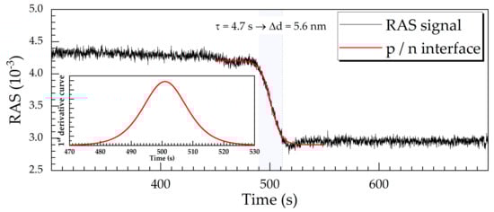 In electronic and optoelectronic devices, pn-junctions are common subunits. Thus, we describe another result here, which is related to pn-junctions. Figure 12 shows the temporal evolution of the RAS signal at 3.05 eV during the etching across a GaAs pn-junction. The charge carrier concentration is 1018 cm−3 for the p-type and 1017 cm−3 for the n-type material, which results in an RAS signal difference of about 1.3·10−3 between the top and the bottom plateau. The RAS signal has a perfect shape according to Equation (2). Following the same criteria adopted above, the time constant gives an etch depth resolution of ±5.6 nm. This is an extremely good result for in situ monitoring of the etching up to (and of course beyond) a pn-junction, even when compared to ex situ techniques.