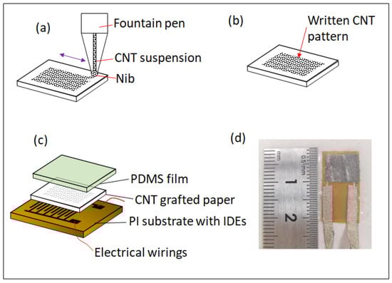 The fabrication process of the piezoresistive element is described in Figure 1, in which the piezoresistive element is composed of three layers from top to bottom: PDMS film, CNT-grafted paper, and a polyimide (PI) substrate with interdigital electrodes (IDEs). Specifically, elastic PDMS film was prepared by mixing silicone gel (Sylgard 184, Dow Corning) with a curing agent with a mass ratio of 10:1, stirring, and vacuuming for removal of air bubbles. The mixture was spin-coated on a glass substrate to form a thin film with a thickness of about 100 µm. Then, it was cured at 60 °C for 8 h. The film was then cut into pieces with a size of 10 mm by 20 mm. The PI substrate with IDEs was custom-made with the specific parameters as follows: the overall size was 10 mm × 20 mm; the thickness was 13 µm; the finger width was 100 µm; the finger distance was 100 µm; the finger length was 6.3 mm; and the number of finger pairs was 20. The conductive layer was constructed by stacking thin films of copper, nickel, and gold with thicknesses of 12 µm, 3 µm, and 1 µm, respectively.