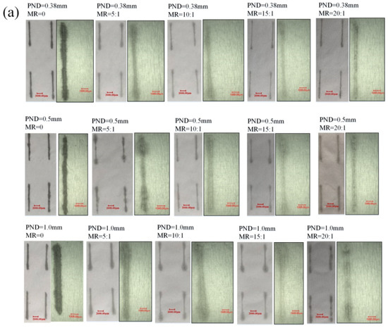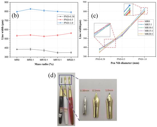 Images of written CNT lines using fountain pens with different nib sizes and different CNT suspension concentrations were taken by an optical microscope and are shown in Figure 2. The widths of the written lines were measured and analyzed using ImageJ software. The dimensional precision of the drawn patterns was investigated by comparing the line widths, and the details are shown in Figure 2a. The influences of the concentration of CNT suspension (i.e., the mass ratio (MR)), and the pen nib diameter (PND) on the patterned line widths are shown in Figure 2b–d. It can be seen that there was no obvious change in the line width of the drawn pattern when the MR varied from 0 to 20:1. When the nib sizes were 0.38 mm, 0.5 mm, and 1.0 mm, the corresponding line widths were about 300 µm, 540 µm, and 800 µm, respectively. Aside from the increasing trend, it was seen that the line width values were approximately equal to the values of the PND. Therefore, the line width of the drawn pattern can be determined and tuned by nib size under normal manual writing speeds. The capability of achieving a high-precision size of the written pattern provides evidence that the direct writing method is capable of creating small sized patterns by using a small pen nib, which is essential to facilitate device miniaturization.