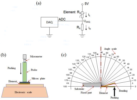 The main characteristics of the fabricated piezoresistive element are the resistance changes under external loadings. A one-kilo Ohms resistor was connected in series with the element to create a voltage divider circuit. A NI data acquisition (DAQ) card was utilized to record the voltage change caused by the variation of the element’s resistance, and a 5 V base voltage was provided for the circuit by the digital pin of the DAQ card. During the testing process, the sampling frequency was set at 1 kHz and the digital signals of response voltage could be monitored from the computer. The circuit diagram is shown in Figure 3a.
