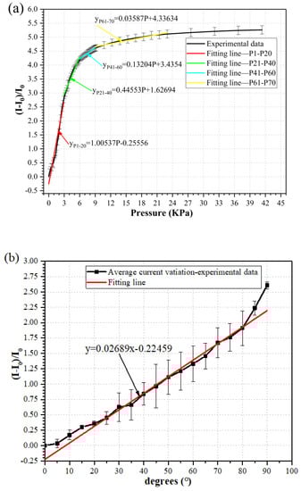It can be seen from Figure 5b that in the bending loading mode, when the loading angle changed from 0° to 90°, the response of the sensor element could be linearly fitted, and the sensitivity was calculated to be 0.02689 degree−1. Within the bending angle ranging from 0° to 90°, the current change of the sensor element was smaller than that in the range of 0 to 23 kPa in the pressure loading mode.