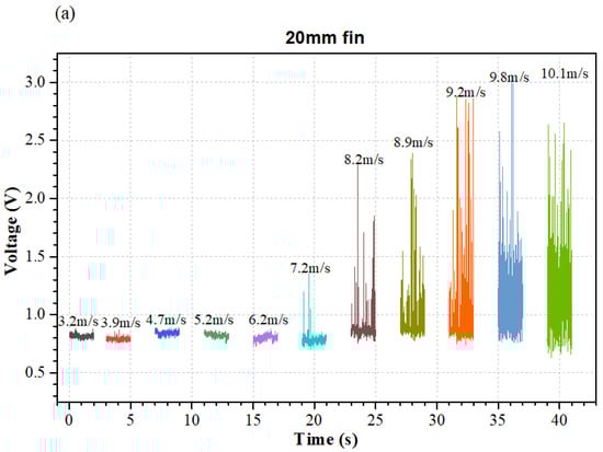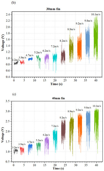 Figure 6a–c presents the raw voltage signals of the airflow sensors with 20 mm fin, 30-mm fin, and 40-mm fin, respectively. It was seen that as the airflow velocity increased in the test range, the voltage signal exhibited an increasing trend. However, it was noticed that the maximum voltage was obviously unstable. Therefore, the maximum voltage value cannot be effectively utilized for evaluating the relationship between the measured voltage and airflow velocity.