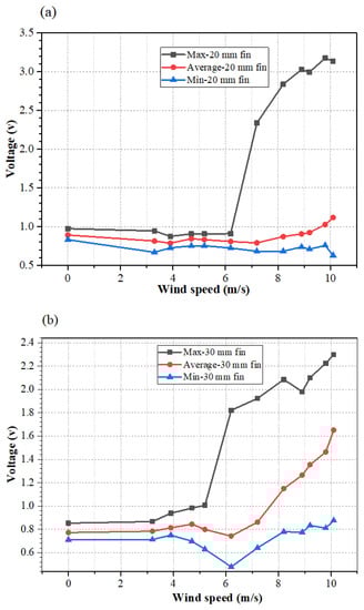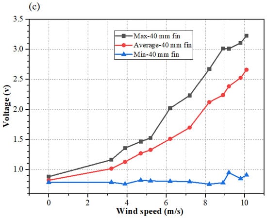 Maximum, minimum, and average values of voltage signals versus wind speed under fin sizes of (a) 20 mm; (b) 30 mm; (c) 40 mm.