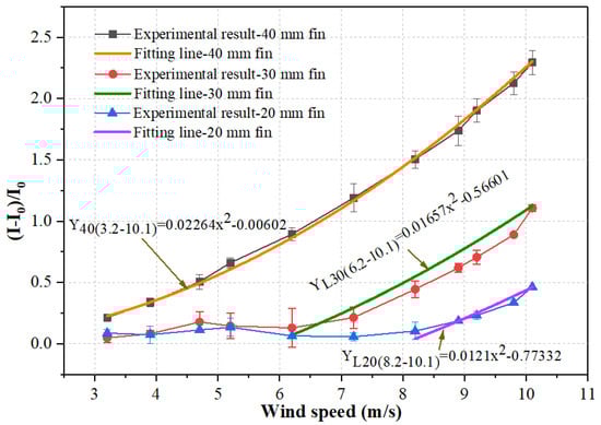 The function f(x) = kx2 + b was utilized to fit the data from the measured current variations in the circuit at different wind speeds, and the fitting results are shown in Table 1. This approach was also adopted by other studies [16,34]. While the response of the 40 mm fin showed good agreement with the fitting curve, the data from other fins with different sizes did not fit well with the function, in terms of the coefficient of determination (COD) R-squared values were smaller than 0.95, as shown in Table 1. This is because sensors with fin sizes of 20 mm and 30 mm cannot work in a low airflow speed range since the piezoresistive element experiences very small pressure.
