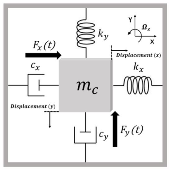A simplified model of a z-axis MEMS vibratory gyroscope is shown in Figure 1, where the x-axis, the y-axis, and the z-axis are the drive, the sense, and the angular velocity input direction, respectively [23]. Additionally, , , represent the damping coefficient and the spring stiffness coefficient on the x-direction and the y-direction. A MEMS vibratory gyroscope is composed of two orthogonal mechanical resonators, called the drive mode and the sense mode, which can be described as a mass-damper-spring second-order system.