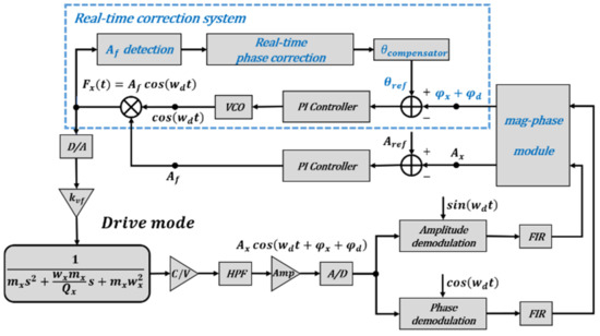 where is the amplitude of the vibration displacement and is the drive phase delay. When the drive force frequency is accurately locked to the drive resonant frequency by the PLL, the vibration amplitude acquires the maximum value, and the phase delay is just −90° [24]. It can be concluded from Equations (6) and (7) that with the difference between the drive force frequency and drive resonant frequency increasing, the vibration amplitude becomes smaller and the phase delay becomes far away from −90° in the working process. Therefore, the phase delay can be changed by adjusting the difference between and .