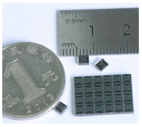 Self-developed shock resistant vibration gyroscopes were adopted in this study. A non-decoupled structure was designed to improve the impact resistance (about 100,000× g, which is crucial in tactical applications) of gyroscopes. To achieve large vibration amplitudes, the silicon wafers prefabricated with sensing structures were anodically bonded under a high vacuum pressure (about 0.8 mbar) at wafer level [29]. A photograph of the wafer-level-package (WLP) capacitive vibration gyroscopes is shown in Figure 6. The size of the gyroscopes was only 3 × 3 mm, and custom-made packages with metal lids were used to avoid the electrostatic charging caused by external sources [30]. The designed real-time circuit phase delay correction system was tested on these self-developed shock-resistant vibration gyroscopes. The circuit control system was mainly composed of an analog front-end circuit and a FPGA, and a USART was used for data acquisition at a 1 kHz sampling rate.