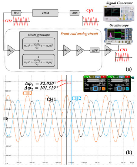 To investigate the feasibility of this real-time correction system, the circuit phase delay of the system was verified by the one-time measurement method, as shown in Figure 9a. The excitation frequency obtained from the open-loop frequency sweep test in Section 4, an excitation signal (CH1) with a frequency of 13,401.45 Hz and an amplitude of 400 mV, was generated by the signal generator (RIGOL DG4202). This signal was collected by the ADC, processed by the FPGA, and then passed through the DAC. After DC isolation, the MEMS gyroscope vibration and the vibration output signal went through CV conversion, filtering, and amplification. An oscilloscope (R&S ®RTO2000) was used to detect the phase change of the excitation signal. Figure 9b shows the test results of three channels (CH1, CH2, and CH3). The circuit phase delay of the signal processing modules (from the ADC to the DAC) was 90° 82.020° 7.98°, and the circuit phase delay of the analog front-end circuit was 101.319° 90° 11.319°. By calculation, the total circuit phase delay of the one-time measurement method was 7.98° 11.319° 19.299°. Comparing with the real-time circuit phase delay correction system, the deviation was only about 1%, which verified that this correction system can accurately and effectively measure the circuit phase delay.