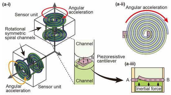 22]. Through the improvement in the target axis sensitivity, it was possible to reduce the relative sensitivity of the other axes. Therefore, if a mirror-symmetric structure is applied to a spiral channel, a uniaxial angular acceleration sensor can be realized with significantly high independence in principle. This sensor structure can be utilized for the sensor unit of a multiaxial angular acceleration sensor. However, due to the potential structural complexity, sensors that extend to multiple axes have not yet been developed.