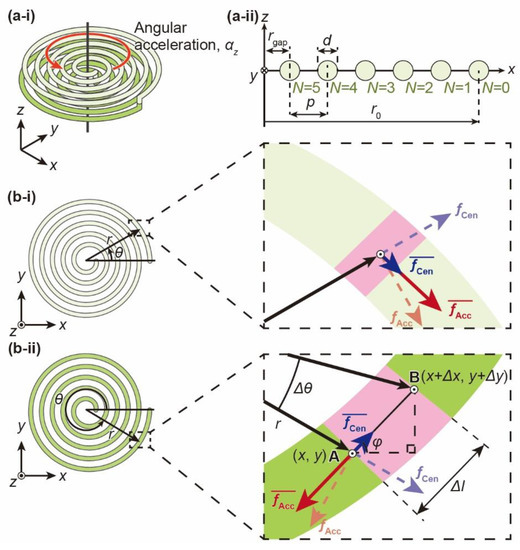 Figure 2(a-ii) shows the parameters of the spiral channels used in this study. The spiral is a physical structure obtained by displacing the end of Archimedes’ spiral by