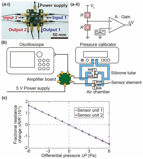 24]. The chambers are connected to a pressure calibrator (Halstrup-Walcher GmbH, KAL 200, Kirchzarten, Germany) via silicone tubes. Then, static differential pressure is applied to the sensor elements from the pressure calibrator. We measure the output voltage of the amplifier using an oscilloscope (Yokogawa Electric Corporation, DL850, Musashino, Tokyo, Japan) while applying differential pressure from −6 Pa to +6 Pa with a 1 Pa interval to a pair of sensor elements. Using the obtained data and Equation (10), we calculate the fractional resistance change ∆