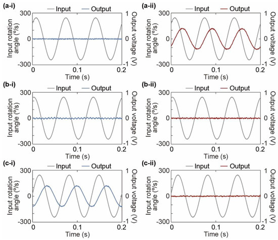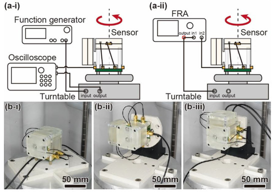 Figure 8(a-ii) shows a schematic diagram of the experimental setup. A sinusoidal voltage, with an amplitude corresponding to 250°/s, is applied to the turntable from the FRA instead of the FG. Then, the sensor response is measured at each frequency as the frequency is varied from 1 to 15 Hz in 0.1 Hz increments.