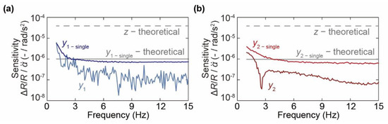 2) for sensor unit 2. The differences from the theoretical value (Equation (11)) are just +3.1% for sensor unit 1 and −1.0% for sensor unit 2. Thus, the target axis sensitivity of each sensor unit is equal to the theoretical value. In addition, the nontarget axis sensitivity is approximately 1/10 to 1/20 of the target axis sensitivity in the low-frequency band. On the other hand, as the frequency increases, it becomes approximately 1/200 to 1/400. The nontarget axis sensitivity in the low-frequency band is mainly due to electrical noise because the applied angular acceleration is relatively low in the low-frequency band. Thus, the actual nontarget axis sensitivity is thought to be 1/200 to 1/400 of the target axis sensitivity. The target axis resolution was calculated as approximately 4 rad/s