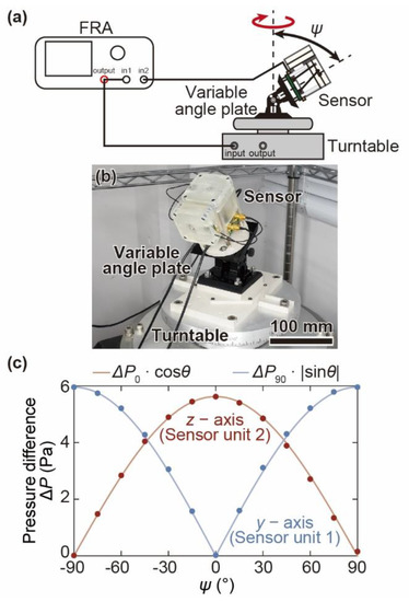 In the experimental results, the sensor response was constant for angular acceleration from 1 to 15 Hz around the target axis. Additionally, the sensitivities were 4.02 × 10−5/(rad/s2) for sensor unit 1 and 3.86 × 10−5/(rad/s2) for sensor unit 2, which were similar to the theoretical value. On the other hand, the nontarget axis sensitivity was canceled by the rotation-symmetric sensor structure, and the response was approximately 1/400 of the target axis. When the angular acceleration sensor was tilted, the magnitudes of the generated differential pressure followed a sinusoidal curve according to the tilt angle. It was confirmed that the target axis sensitivity was not affected by the sensitivity of other axes.