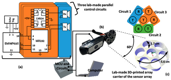The structure of the proposed hybridized platform includes (a) the control and readout circuits of the ultrasonic sensors, (b) the hybridized ultrasonic and image sensors, and (c) the 3D-printed package of the ultrasonic sensor array. The arrangement of the ultrasonic transmitters (Tx) and receivers (Rx) is also shown in (c). The central transmitter has a common control scheme with one of the readout circuits.