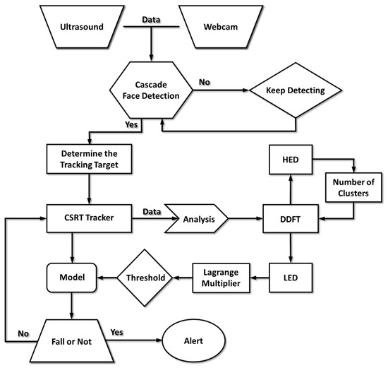 However, video-based detection methods also suffer problems when the tracked subject engages in rapid motions or drastically changes its body shape. In these circumstances, the conventional bounding box techniques deal poorly with the extraction of moving features without any additional technical assistance, even in detecting and tracking the subject continuously [4,15]. To resolve this predicament, we propose a new framework for fall detection by hybridizing the unique sensing mechanisms of video and ultrasonic sensors. We adopt the technique of cascade face detection [27,28,29] to detect the potential tracked subject and a channel and spatial reliability tracking (CSRT) tracker [30,31] for continuous subject tracking. After confirming the tracked subject, the hybridized sensing module collects the longitudinal and transverse motional trajectories from the moving subject. The collected raw data can remap to a three-dimensional (3D) movement trajectory of the moving subject, and then the map is used to estimate the corresponding 3D position and speed centroids. Meanwhile, we also use data density functional theory (DDFT) [4,32] to measure the data cluster number and the corresponding cluster boundaries from the raw data. Finally, we construct a probabilistic map for human fall prediction by considering the 3D centroids and cluster boundaries as prior information. In summary, this research aims to develop a low-cost strategy by hybridizing the sensing mechanisms from a webcam and ultrasonic sensors. The sensing mechanisms and the corresponding detection-tracking algorithms can be built into an MCU to perform human fall detection with acceptable computational complexity.
