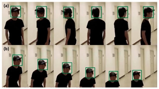 The image series shows the performance of the synergy of cascade face detection and CSRT tracker. The image in (a) exhibits the tracking results when the subject stands with their back to the camera. The image in (b) shows the tracking results when the subject is in a sudden fall situation.