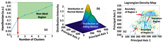Figure 5 illustrates the theoretical results of the most probable cluster number and corresponding cluster boundaries estimated by estimating the Hamiltonian curve and the Lagrangian density map, respectively. As shown in Figure 5a, the Hamiltonian curve shows energy fluctuations under different cluster numbers. The slopes of these energy fluctuations gradually became stable as the input cluster number increased above two. This means that the most probable cluster number should be two, as the red arrow indicates. The non-ideal region depicted in Figure 5a exhibits the uncertainty of the collected data. It might be caused by detection errors, an algorithmic flaw, or other data imperfections [4,32]. According to the theoretical cluster number, Figure 5b exhibits the data distribution estimated by employing the discrete-type DDFT. The distribution intensity of the normal motion was higher than that of the falling motion. However, the scattering region of the falling motion was larger than that of the normal motion. Figure 5c also exhibits a similar phenomenon. This reveals that human falling motion has higher instability than that of normal walking. Meanwhile, there are still many data points between these two clusters. These data points indicate that there must be a transition stage that exists between the normal and falling motions. Thus, we defined the regions which are 1.5 standard deviations beyond these cluster distributions with as the transition regions.