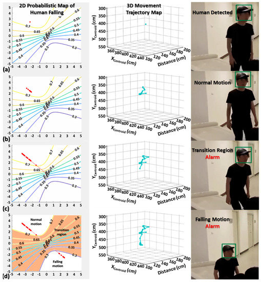 This figure illustrates the corresponding 2D probabilistic maps, 3D movement trajectory maps, and the detection-tracking results of (a) detecting a potential subject, (b) normal motion, (c) transition region, and (d) falling motion. Any motions making the data points appear in the transition region might trigger alarms.