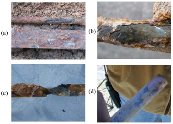 The grounding grid is an important device that ensures the safe operation of the power system; it plays the role of balancing voltage and discharging current in the event of a lightning strike or equipment failure [1,2]. However, due to the grounding conductor being buried underground for a long term, the corrosion caused by the soil environment and the working conditions inevitably can lead to the destruction of the grounding conductor [3,4,5]. The corrosion of the grounding conductor is shown in Figure 1. When the ground conductor fault occurs in the power system, the current cannot fully spread in the soil. In this case, the ground resistance and ground potential rise, and high voltage is connected to the secondary circuit, which affects the safe operation of electrical equipment and personal safety, causing major accidents and economic losses [3,6,7].