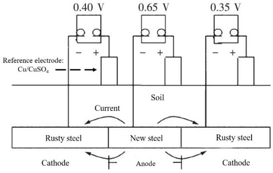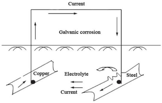 The connection between different metals will cause galvanic corrosion due to different potentials. Figure 3 shows the galvanic corrosion cell formed by connecting carbon steel and underground copper components. The area ratio of cathode to anode is an important factor in the galvanic corrosion process. Since the corrosion process of most metals in the soil is controlled by the diffusion of oxygen, an increase in the area of the cathode increases the amount of oxygen reduced on its surface. The number of circulating electrons then increases, and the intensity of corrosion current also increases, resulting in faster corrosion [19,41,56]. Galvanic corrosion can also occur when new materials are used to replace rusty materials to repair damaged grounding grids. Due to the different natural corrosion potentials of the new and old materials, the two will form a galvanic corrosion cell when they are connected to each other. The galvanic corrosion cell formed by the contact of new and old grounding materials is shown in Figure 4. Due to the presence of the corrosion product layer on the surface, the rusted material has a higher potential and acts as the cathode of the corrosion cell, and the new material acts as the anode to accelerate corrosion [19].