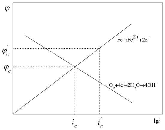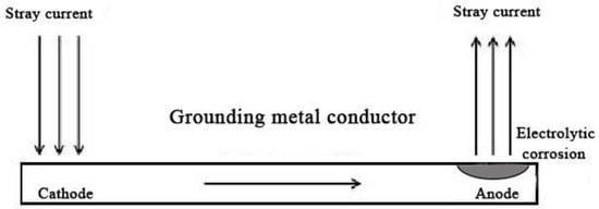 Stray current corrosion is a type of electrochemical corrosion. DC stray current is mainly generated by a DC power transmission system, a cathodic protection system and other power systems with DC power sources [61]. The corrosion mechanism of DC stray current is similar to electrolytic corrosion. The corrosion damage area of DC stray current is relatively concentrated. It can cause rapid corrosion of the ground grid structure, and the corrosion effect on the ground grid material is more severe than other environmental factors. As shown in Figure 5, the part where the stray current flows into the grounding material is protected as the cathode, and the part where the stray current flows out is used as the anode to accelerate corrosion. The DC stray current is analyzed through the schematic of polarization curves (Figure 6). In fact, the stray current polarizes the self-corrosion potential anode from to ; the corresponding corrosion current increases from to , and is the amount of corrosion increased due to stray current. The amount of metal corrosion caused by DC stray current can be calculated according to Faraday’s law. According to calculations, 1 A current can approximately corrode 9.1 kg iron, 20.7 kg copper, and 4.0 kg magnesium in one year. It can be seen that the DC stray current can cause serious corrosion damage to the grounding grid metal [62,63,64].