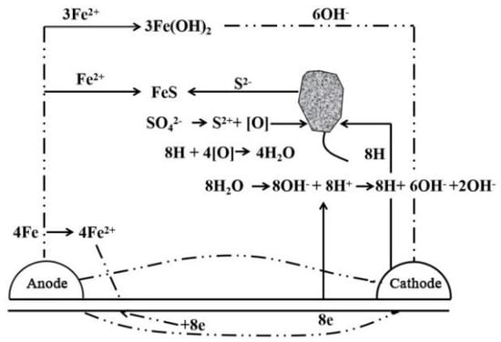 Sulfate-reducing bacteria are one of the most important factors that cause microbial corrosion. In an anoxic soil environment, sulfate-reducing bacteria multiply in large numbers and promote the cathodic depolarization reaction of the corrosion process through biological catalysis, which greatly accelerates the corrosion of metals [66,67]. Its principle of action is shown in Figure 7. In addition to sulfate-reducing bacteria, thiobacillus is also a microorganism that can affect soil corrosion. Thiobacillus includes two types: thiobacillus thiooxidant and thiobacillus thioparus. Thiobacillus thiooxidant oxidizes the sulfur element produced by thiobacillus thioparus to sulfuric acid to acidify the metal environment and accelerate the corrosion of the metal.