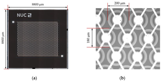 A microscope photograph of the fabricated CMUT device die. (a) Top view of the fabricated CMUT device with 900 cells; (b) magnified view of cells.