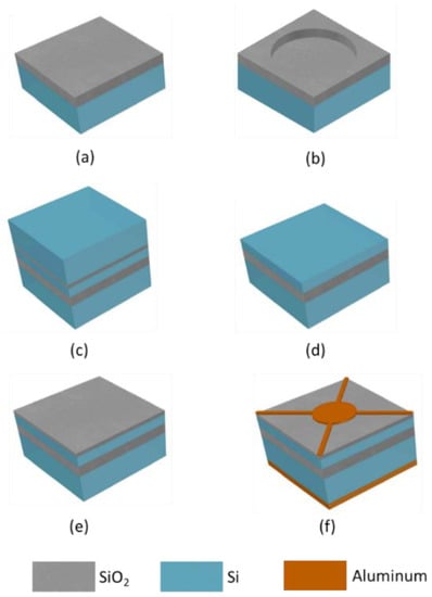 First, the oxide layer was etched 650 nm away from the total 800-nm thickness to define cavities on the oxide mono-crystalline silicon wafer, as shown in Figure 3b. Next, the SOI wafer and the cavities patterned oxide silicon wafer were pre-bonded in the vacuum at room temperature, and the pre-bonded wafers were annealed at high temperature, with a maximum temperature up to 1150 °C, which denoted the fusion bonding process, as shown in Figure 3c. The handle layer and the buried oxide (BOX) layer of the SOI wafer were then removed to release the thin membranes of the device layer by performing the Chemical Mechanical Polish (CMP) step and wet etching, as shown in Figure 3d. At that point, an SOI wafer with cavities was fabricated and a 100-nm thick oxide silicon layer was deposited on the device layer, as shown in Figure 3e. After that, around the device cells, the patterned silicon membrane trenches were defined and etched to the oxide layer to isolate the device electrically from the other devices and frame structure. Finally, the aluminum metal layer was sputtered on the side of the device layer of the cavity SOI and patterned, thus forming the top electrode of the CMUT device. Another aluminum metal layer was sputtered on the side of the handle layer of the cavity SOI but not patterned, thus forming the bottom electrode of the CMUT device, as shown in Figure 3f. Annealing was performed to make ohmic contact between the bottom electrode and highly-doped silicon substrate.