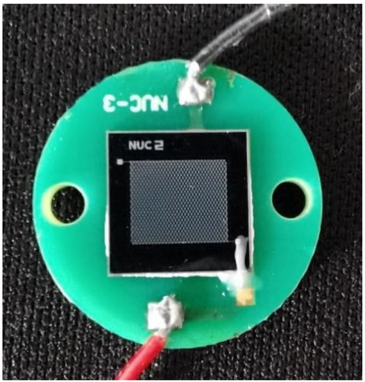 The fabricated CMUT die was glued to a printed circuit board (PCB). The whole bottom electrode of the die was glued to the pad on the PCB by conductive epoxy, and the pad of the top electrode was wire-bonded to another pad on the PCB. In order to make CMUT work underwater, a waterproof package was needed. Parylene-C is a protective polymer material and is widely used for waterproofing sensors. After gluing and wire-bonding the die, a 5-μm thick Parylene-C was conformally deposited on the PCB by vapor deposition in order to seal the device, PCB, and wires for immersion operation. The CMUT device with the Parylene-C coating is shown in Figure 4.