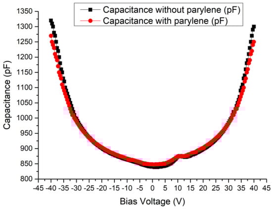 The CMUT’s operating principle is based on the elastic deformation of the thin plates of the capacitors under electrostatic force or acoustic wave. The thin plate was composed of the top electrode, oxide silicon insulating dielectric layer, and the silicon membrane. The capacitance-voltage (CV) characteristics of the CMUT device directly illustrate the quantitative relationship between the structure deformation and bias voltage. The CV curve is also related to the device’s important parameters, such as sensitivity, electromechanical conversion efficiency, and collapse voltage. The CV measurements were performed using the KEYSIGHT E4990A impedance analyzer, and bias voltage swept from −40 V to 40 V. The CV curves are presented in Figure 5. The black curve was obtained from the measurement results of the CMUT without Parylene-C on the PCB, and the red curve was obtained from the results of the same CMUT with deposited 5-μm thick Parylene-C.