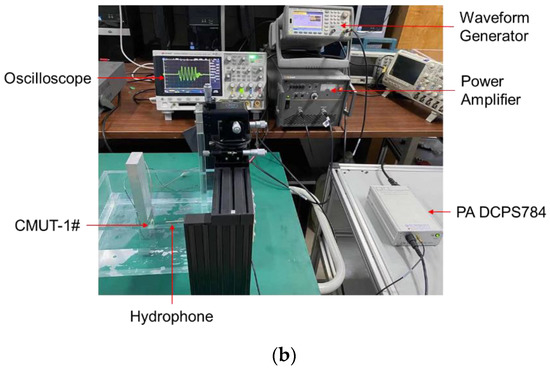 (a) Schematic of the measurement setup of the CMUT transmitting performance; (b) photograph of the measurement setup.