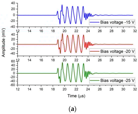 As shown in Figure 9c, the output amplitude of the CMUT-1# increased with the absolute voltage value. The difference of the output amplitudes of CMUT-1# at negative and positive bias voltages was small at the same absolute voltage. The maximum output voltage difference was only 103.8 mV, and the voltage difference when the bias voltages of −25 V and 25 V were applied was only 4.39%. The output responses indicate that the receiving performance of the designed CMUT is related to the absolute DC bias voltage amplitude but not the voltage polarity. It was demonstrated again that the change of capacitance was related to the absolute voltage and irrelevant to the polarity. 5-cycle pulse signals were clearly visible in the output response of the CMUT-1#, as shown in Figure 8a,b, which proves that the CMUT-1# dynamically responsed to the ultrasound waves at different bias voltages. In the non-collapse working mode, the output amplitudes of CMUT-1# increased with the increase of the bias voltage, as shown in Figure 9c, which is consistent with the theory.
