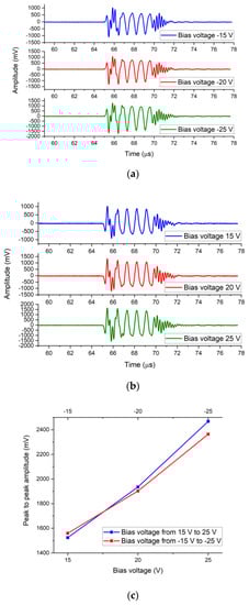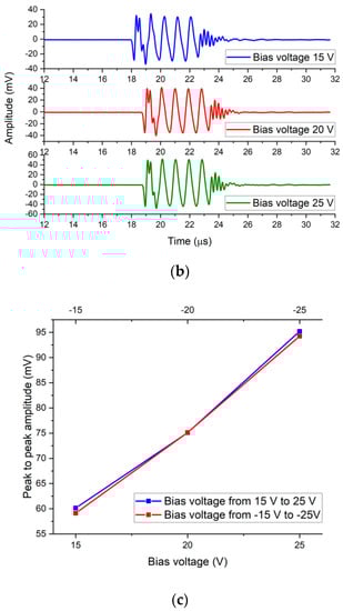 (a) Response waveforms of the hydrophone when the CMUT was driven by the DC bias voltages from −15 V to −25 V; (b) response waveforms of the hydrophone when the CMUT was driven by the DC bias voltages from 15 V to 25 V; (c) peak-to-peak response amplitude of the hydrophone when the CMUT was driven by different DC bias voltages.