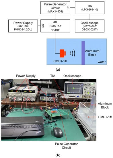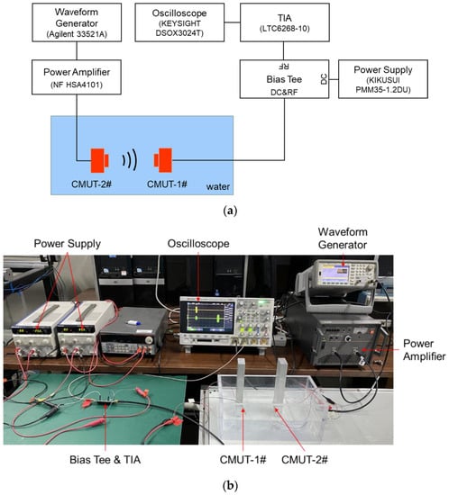 (a) Schematic of the measurement setup of the CMUT pulse-echo signal; (b) photograph of the measurement setup.