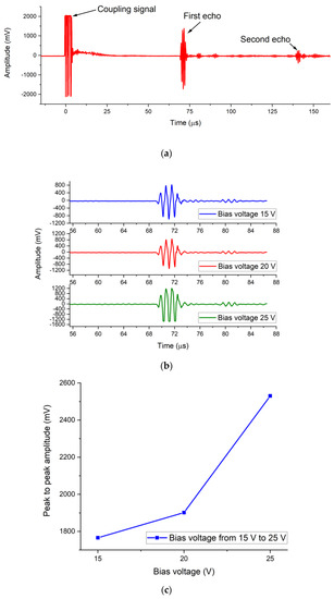 (a) Pulse-echo impulse response; (b) the first pulse-echo impulse responses when the CMUT device was biased at 15 V, 20 V, and 25 V; (c) peak-to-peak amplitude of the first echo signals when the CMUT was driven by different DC bias voltages.