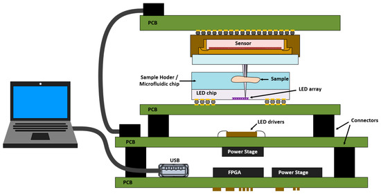 As mentioned above, the three microscope setups were assembled based on three different LED array configurations to explore the technology potential progressively. Through all the microscope versions, the system architecture was maintained, since the microscope principle is the same for all of them. Figure 2 shows the basic microscope stack-up structure implemented, with the sample laying over the LED array chip and the optical sensor on top collecting the transmitted light. The architecture was designed modularly to provide flexibility to test each microscope element independently and allow easy replacement without compromising the rest of the system. To that end, each component of the microscopes was implemented on a separated printed circuit board (PCB) carrier. All the key elements of the setup (LEDs, the drivers, and the CMOS sensor) were connected to an FPGA board. The FPGA controls the microscope operation, with all the routines such as image acquisition, calibration, and test procedures implemented at the hardware level, relegating the computer to displaying images and selecting configuration settings through the graphical user interface.