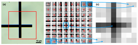 Transmission image reconstruction of the intersection of two lines of 5 µm width using the Led1 and MT9V024 image sensor as a light collector. The sensing area used was 9 × 9 pixels. (a) Optical image of the intersection of two lines of 5 µm width with the observed area highlighted in red. (b) Composition of the different raw shadow images generated by each micro-LED with the sensing area highlighted in red. (c) Reconstructed transmission image using the spatially resolved illumination.