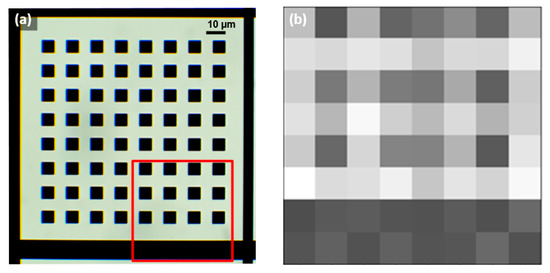 (a) Optical image of the EBL pattern of 6.4 µm squares regular spaced at 6.4 µm, with the observed region highlighted in red. (b) Image reconstructed with the microscope prototype based on the 8 × 8 5 µm LED array chip (Led1), which presented aliasing, indicating the limit to observe periodic objects of sizes comparable to the LED.
